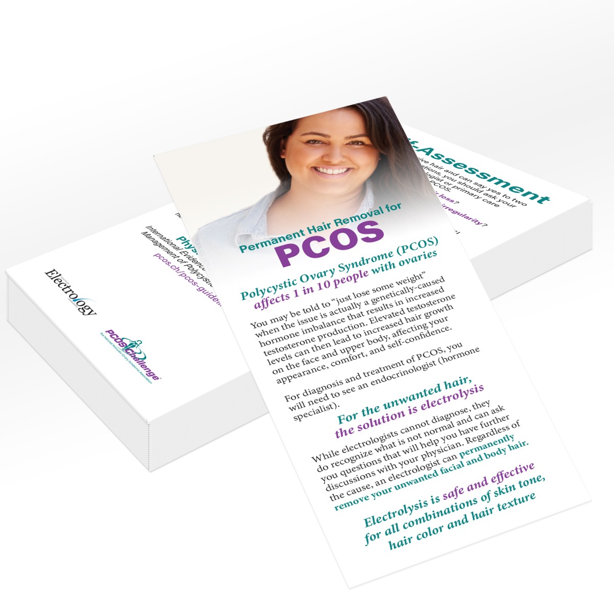 Beautifully presented electrolysis information and self-assessment for people suffering from PCOS developed in cooperation with The National Polycystic Ovary Syndrome Association (PCOS Challenge). Compact 3.75 x 8.5 sell sheet fits in a standard mailing envelope or brochure holder. Printed on both sides, in full color, on glossy card stock. Pack of 50.
