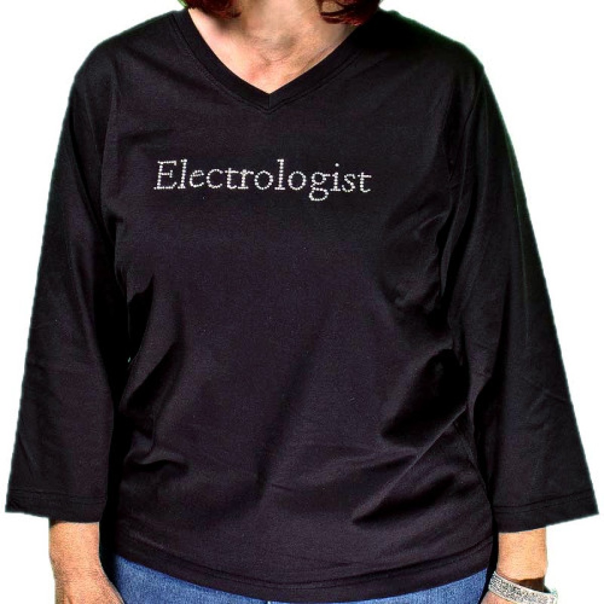 This 3/4-sleeve v-neck tee is a sparkling conversation starter about the electrology profession. 100% cotton. Preshrunk. Black with "Electrologist" spelled out in white rhinestones.